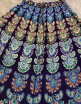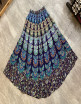 This is a flared skirt adorned with ethnic elephant and peacock patterns on a navy background.